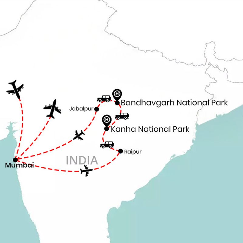 Comenzamos el día muy temprano. A las 04:30 h, salimos del hotel rumbo al aeropuerto de Mumbai para tomar nuestro vuelo de las 06:40 h hacia Raipur. Tras un breve trayecto, aterrizamos a las 08:40 h, donde nos espera nuestro conductor para iniciar el viaje por carretera hacia Kanha Tiger Reserve, atravesando paisajes rurales, bosques y pequeñas aldeas que nos introducen en la esencia del corazón de la India.