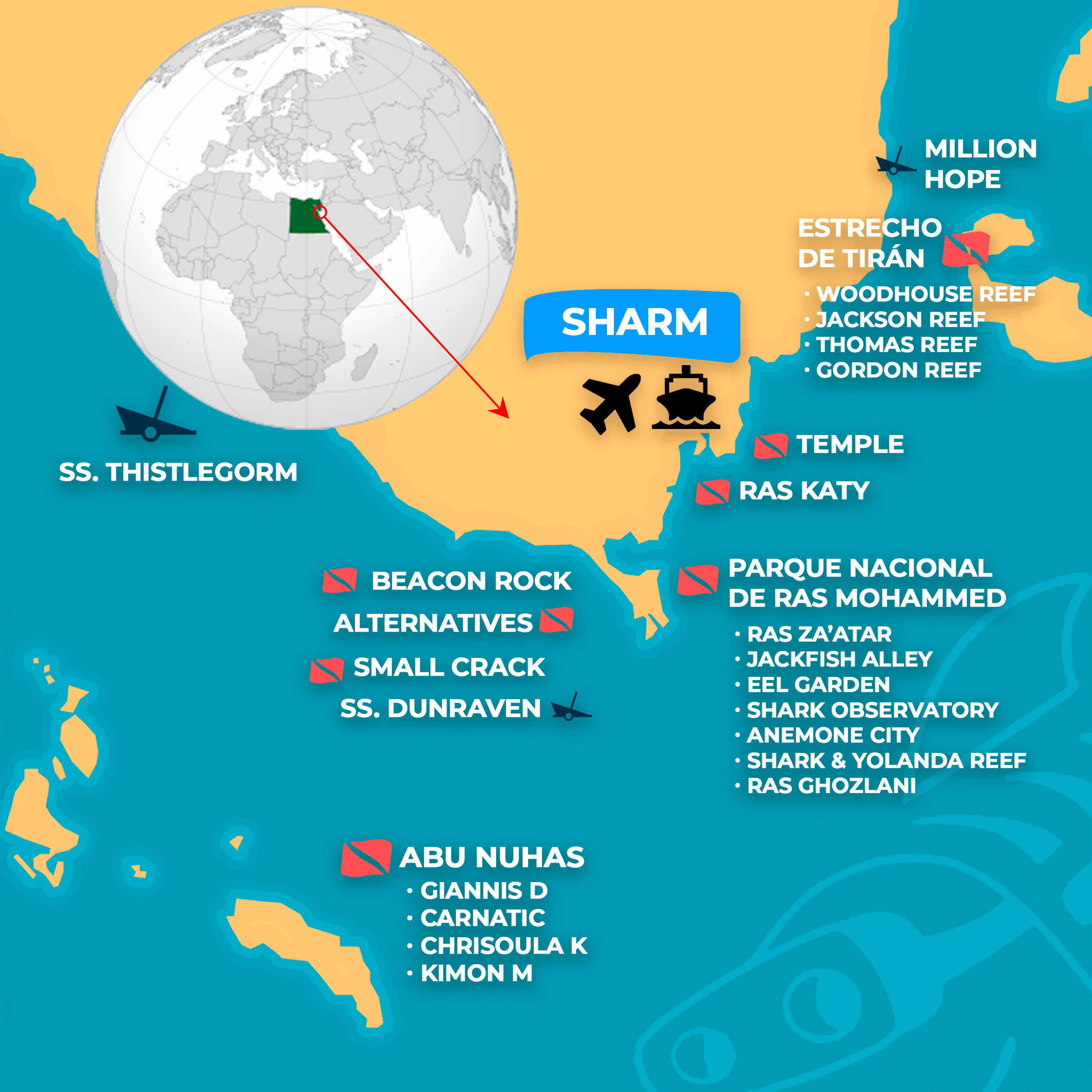 También exploraremos otros enclaves imprescindibles como los arrecifes de Ras Mohamed, los estrechos de Tiran, y zonas como Abu Nuhas y los Straits of Gubal, donde el coral brota en todos los colores y formas, y donde la biodiversidad marina sorprende en cada buceo.